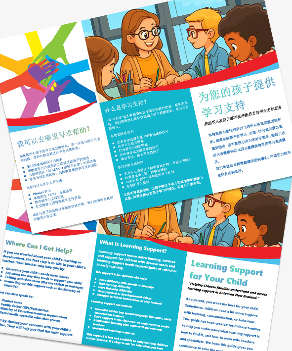 Zujun discovered that many Chinese families who have recently arrived in Aotearoa New Zealand have difficulty understanding and accessing learning support due to language barriers. In response to this issue, he developed a bilingual English-Chinese brochure on learning support in Aotearoa.