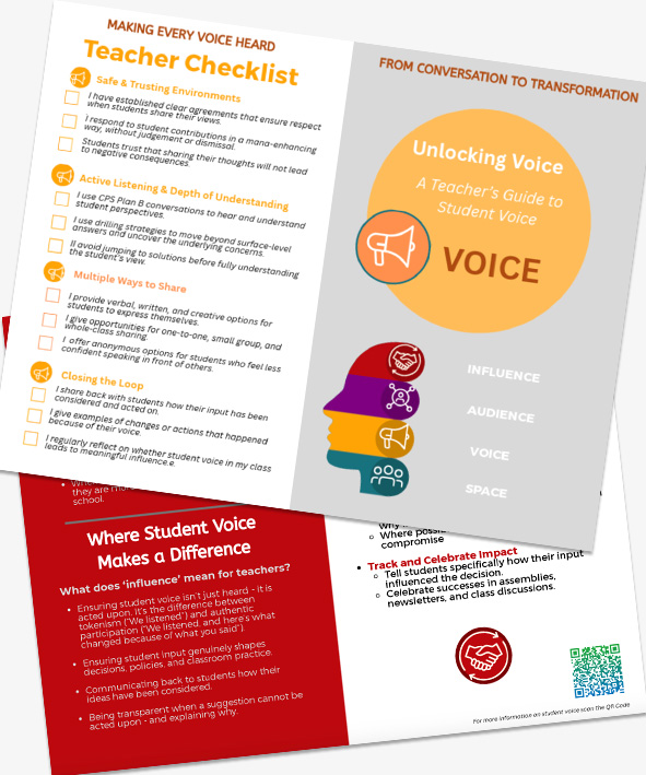 Jo learned that the collection of student voices is often tokenistic and inconsistent. To address this challenge, Jo developed brochures based on Lundy’s (2007) model of child participation to help teachers learn how they can collect and act on student feedback in meaningful ways.